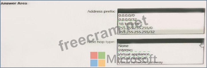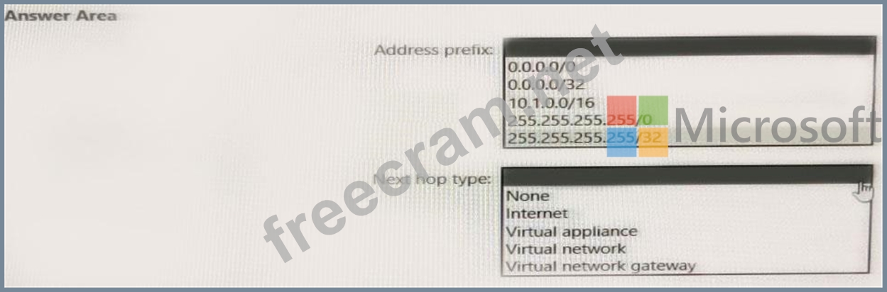 You are implementing the virtual network requirements for VM Analyze. What should you include in a custom route that is linked to Subnet2? To answer, select the appropriate options in the answer area. NOTE: Each correct selection is worth one point.