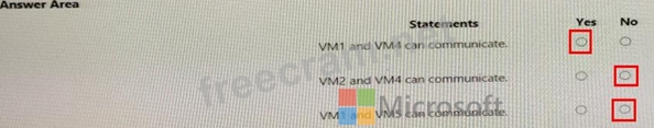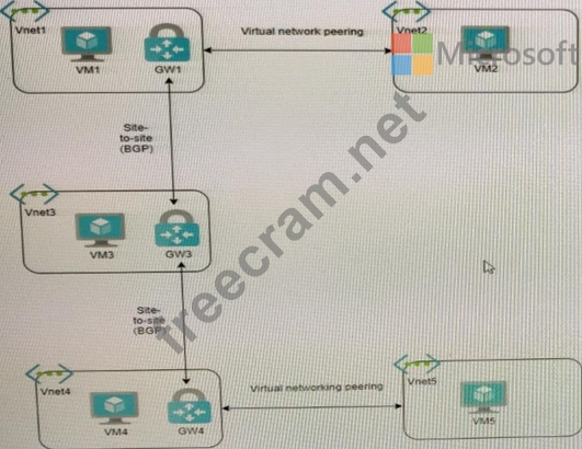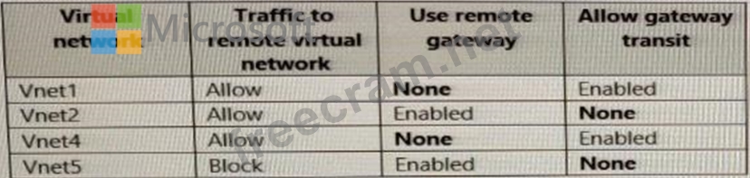 You have virtual network peering between Vnet1 and Vnet2. You have virtual network peering between Vnet4 and Vnet5. The virtual network peering is configured as shown in the following table.