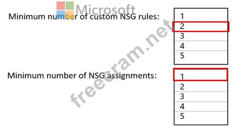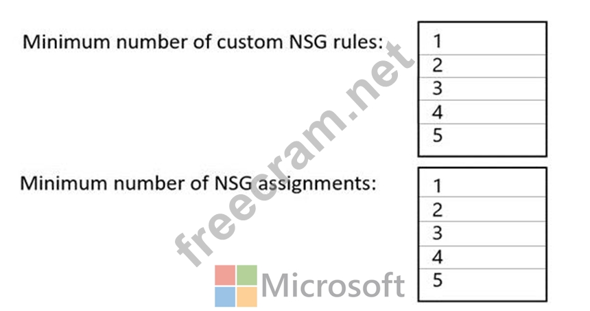 You need to restrict traffic from VMScaleSet1 to VMScaleSet2. The solution must meet the virtual networking requirements. What is the minimum number of custom NSG rules and NSG assignments required? To answer, select the appropriate options in the answer area. NOTE: Each correct selection is worth one point.