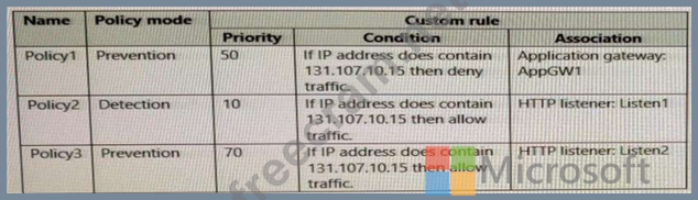You create Azure Web Application Firewall (WAF) policies for AppGW1 as shown in the following table.