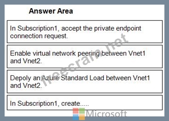 You have two Azure subscriptions named Subscnption1 and Subscription2. Subscription1 contains a virtual network named Vnet1. Vnet1 contains an application server. Subscription2 contains a virtual network named Vnet2. You need to provide the virtual machines in Vnet2 with access to the application server in Vnet1 by using a private endpoint. Which four actions should you perform in sequence? To answer, move the appropriate actions from the list of actions to the answer area and arrange them in the correct order.