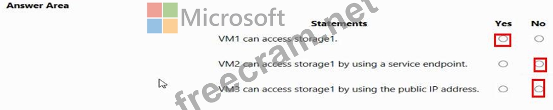 The Firewalls and virtual networks settings for storage1 are configured as shown in the Storage1 exhibit. (Click the Storage1 tab.) For each of the following statements, select Yes if the statement is true. Otherwise, select No. NOTE: Each correct selection is worth one point.