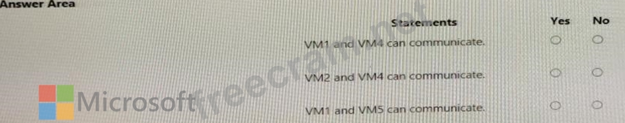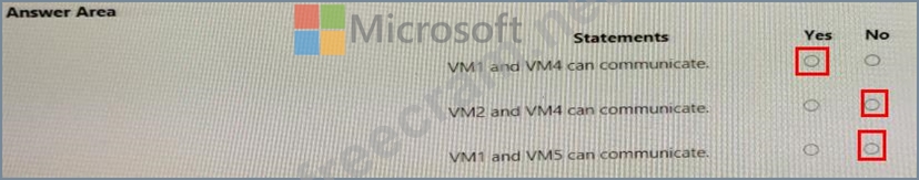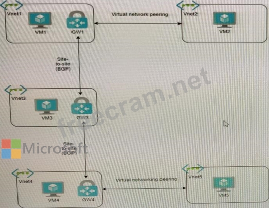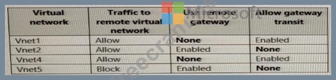 You have virtual network peering between Vnet1 and Vnet2. You have virtual network peering between Vnet4 and Vnet5. The virtual network peering is configured as shown in the following table.