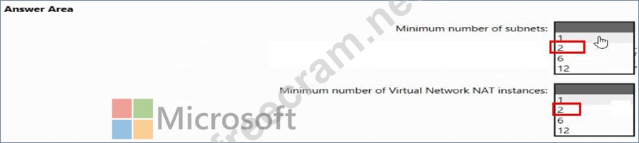 You need to identify the minimum number of subnets and Virtual Network NAT instances required to meet the following requirements: