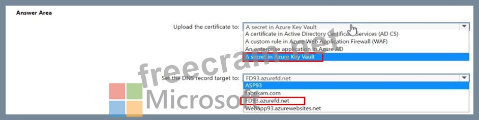 You need to configure a DNS record for www.fabrikam.com and upload the certificate to Azure. What should you do? To answer, select the appropriate options in the answer are a. NOTE: Each correct selection is worth one point.