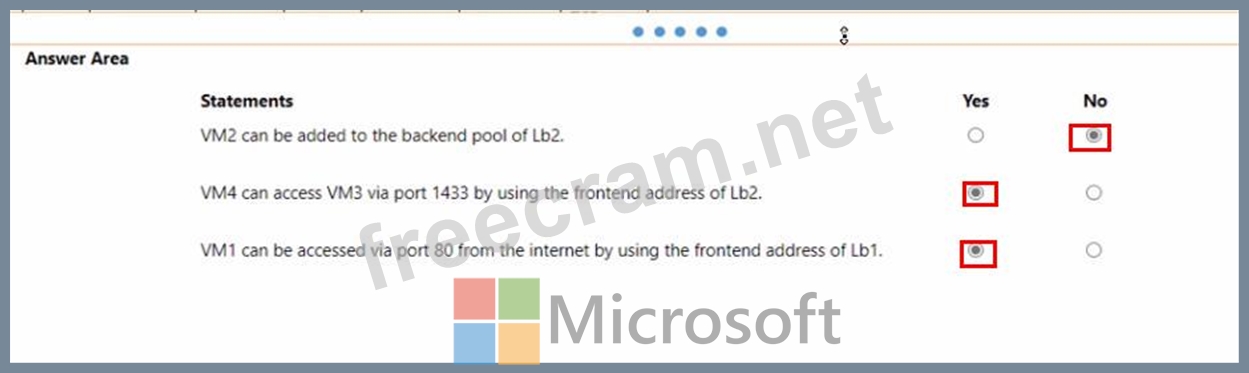 1. NO. A backend pool can only contain resources from one virtual network. VM2 (VNet1) VM3 (VNet2)