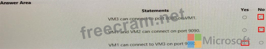 VM1 is in Subnet1. NSG1 applies. Only traffic on ports 80 and 443 will be allowed. Connection on port 9090 will be denied.