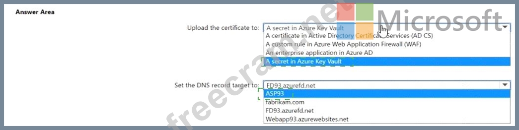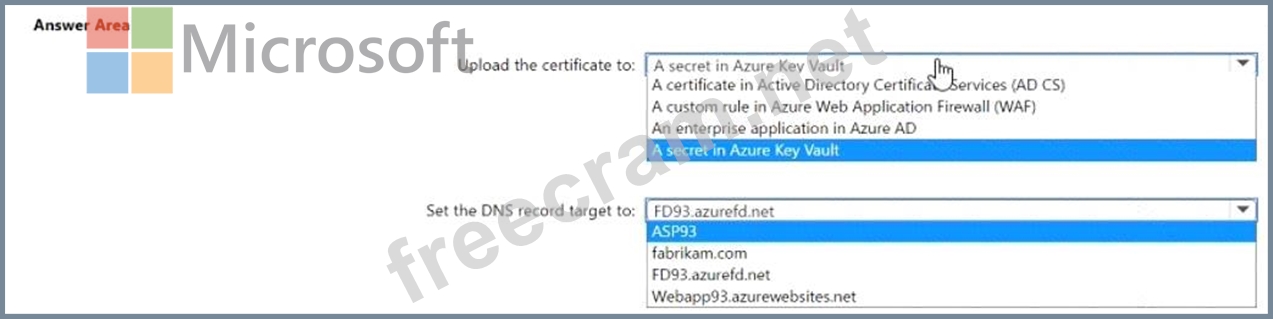 You need to configure a DNS record for www.fabrikam.com and upload the certificate to Azure. What should you do? To answer, select the appropriate options in the answer area. NOTE: Each correct selection is worth one point.