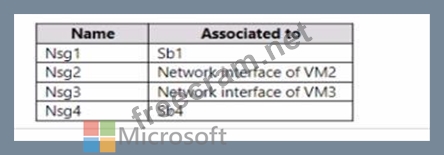 Vne1l contains two virtual machines named VM1 and VM2. Vnet2 contains two virtual machines named VM3 and VM4. You have the network security groups (NSGs) shown in the following table that include only default rules.
