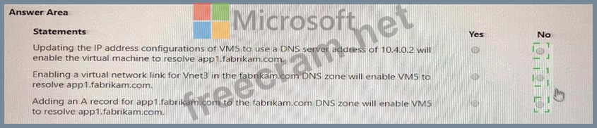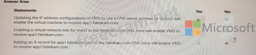 The virtual network links in the fabrikam.com DNS /one are configured as shown in the exhibit. (Click the Exhibit tab.) VMS fails to resolve the IP address for.appKfabrik3in.com.