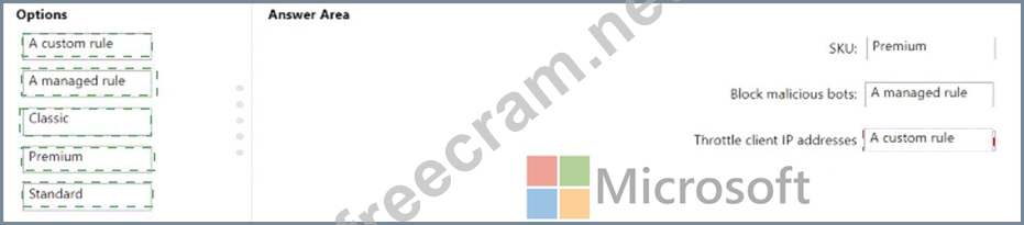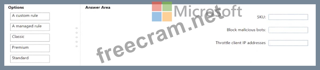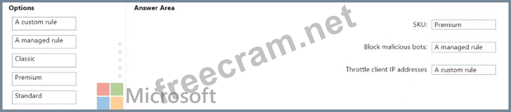 You need to identify which Front Door SKU to configure, and which type of rule to configure for each requirement. The solution must minimize administrative effort and costs.
