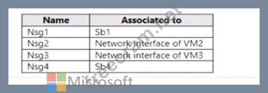 Vne1l contains two virtual machines named VM1 and VM2. Vnet2 contains two virtual machines named VM3 and VM4. You have the network security groups (NSGs) shown in the following table that include only default rules.