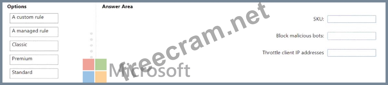 You need to identify which Front Door SKU to configure, and which type of rule to configure for each requirement. The solution must minimize administrative effort and costs.