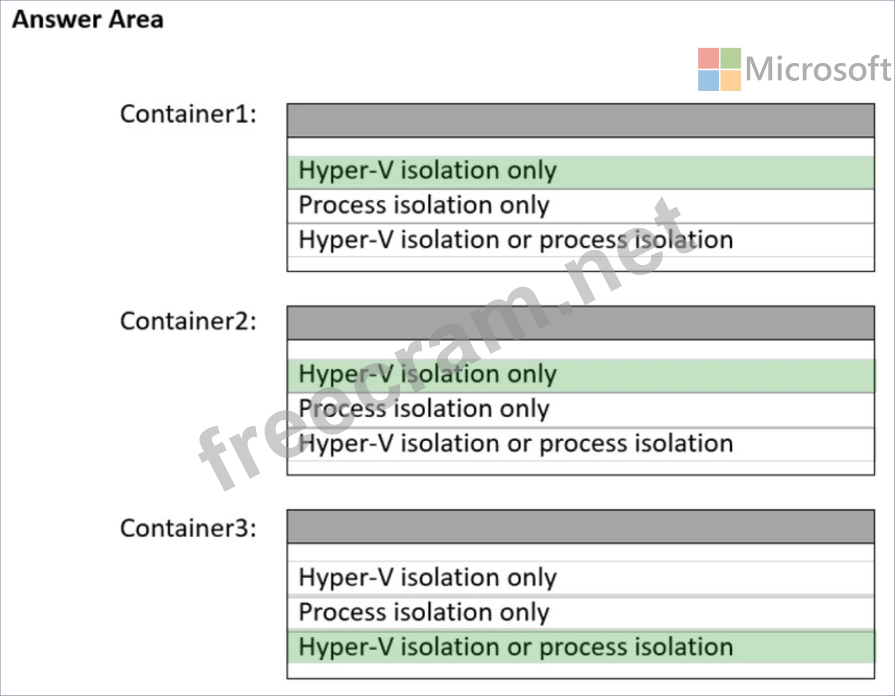 Which isolation mode can you use for each container? To answer, select the appropriate options in the answer area.