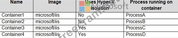 https://argonsys.com/microsoft-cloud/library/how-to-identify-processes-running-inside-a-windows- container-from-the-container-host/ ProcessC is in a hyper-V isolation container in contrast, so only Container3 can see the process.