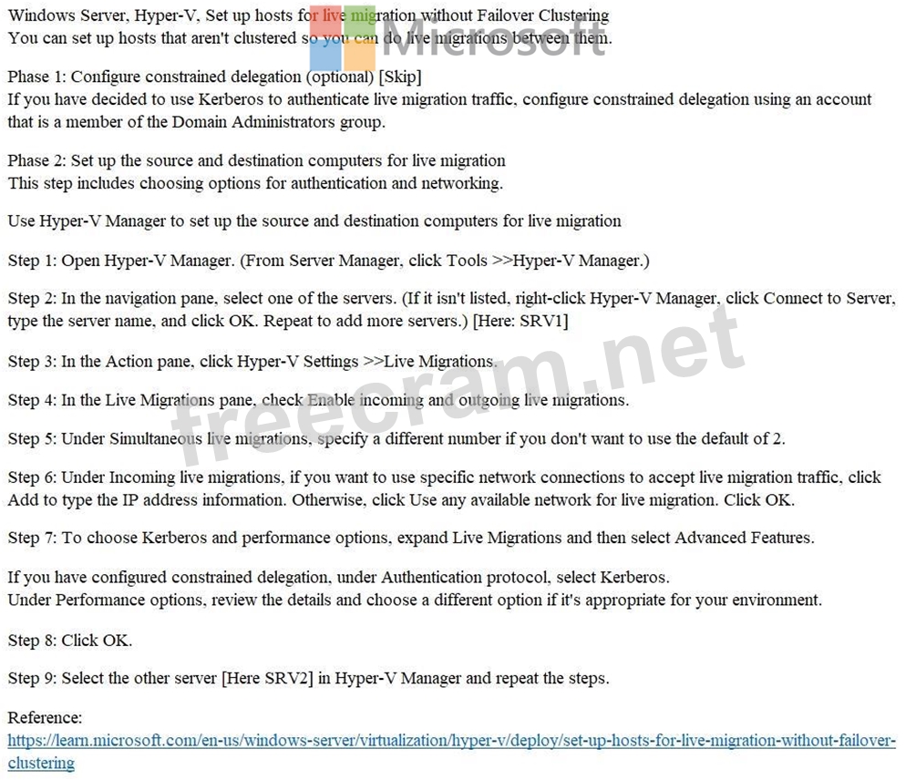 You need to configure Hyper-V to ensure that running virtual machines can be moved between SRV1 and SRV2 without downtime.