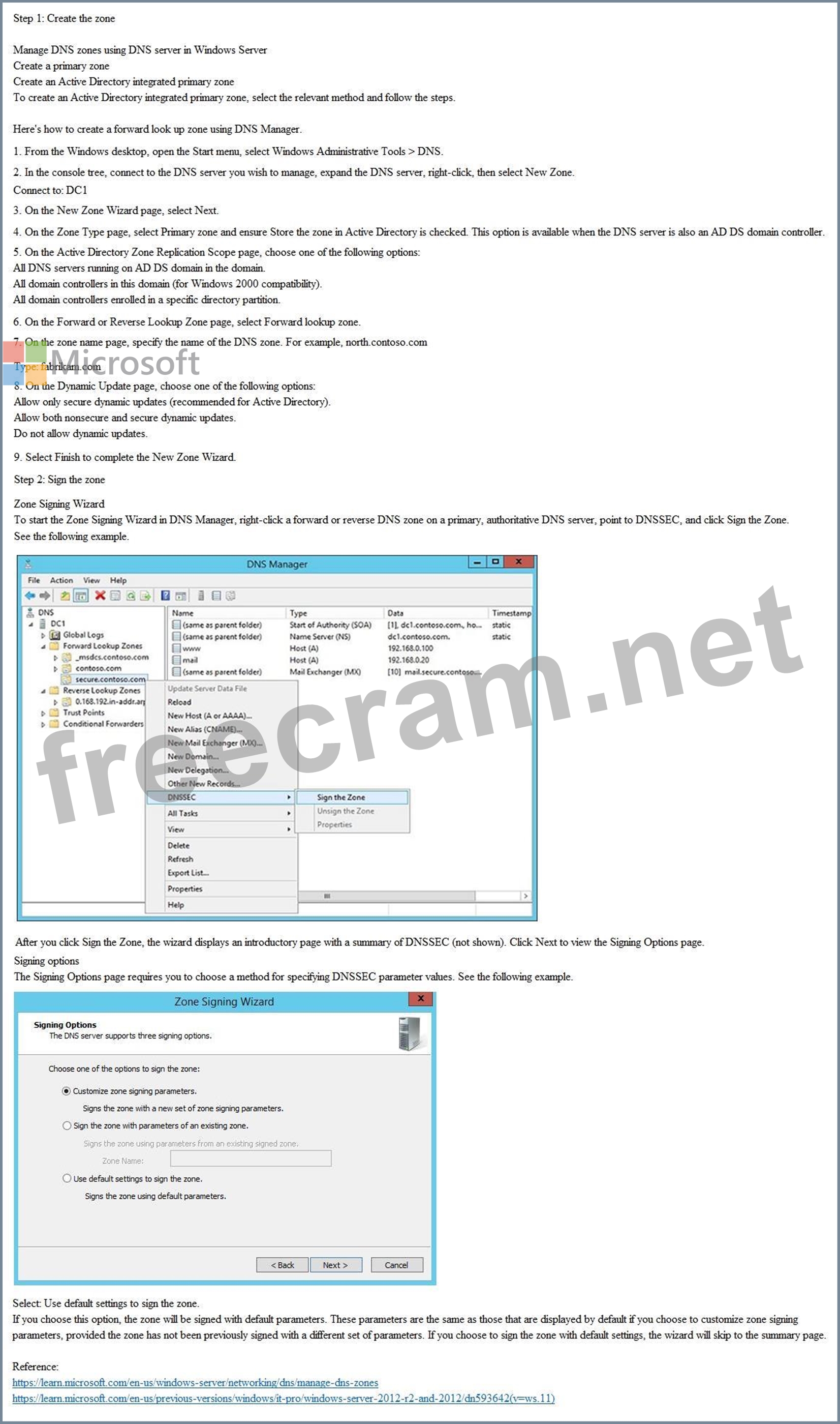 You need to deploy a new primary DNS zone named fabrikam.com to DC1. The zone must be signed.