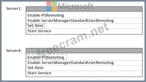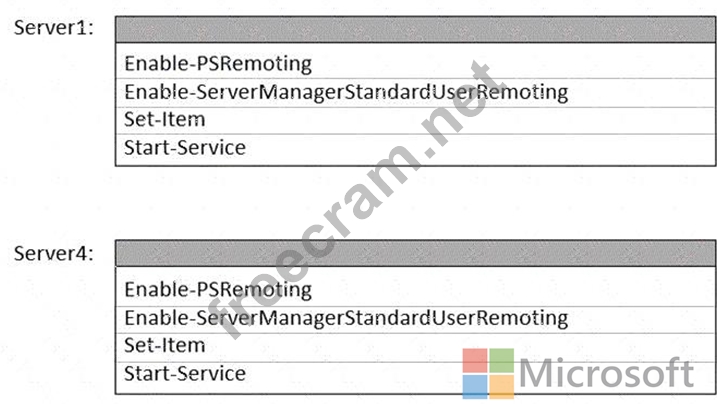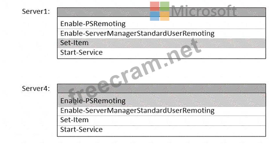 Which cmdlets should you run on Server1 and Server4? To answer, select the appropriate options in the answer area.