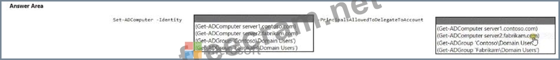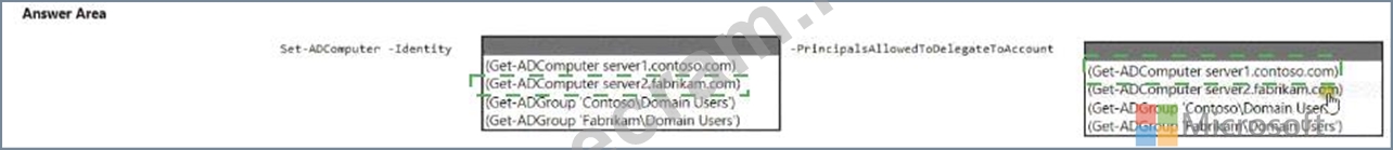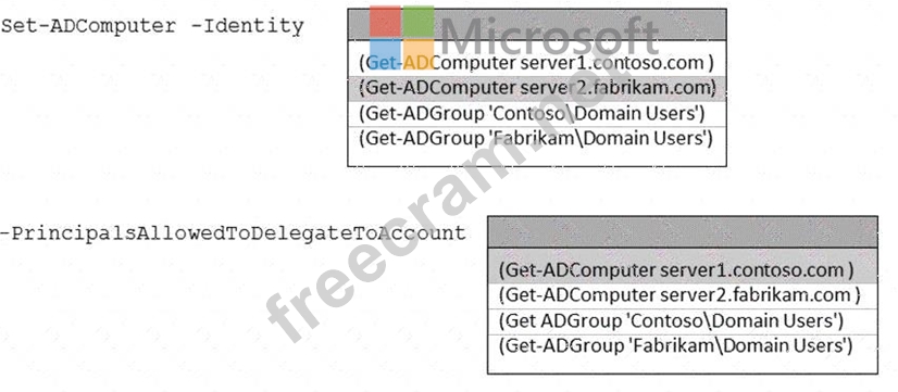 You need to configure resources based constrained delegation so that the users In contoso.com can use Windows Admin Center on Server) to connect to Server? How should you complete the command? To answer, select the appropriate options in the answer area. NOTE: Each correct selection is worth one point.