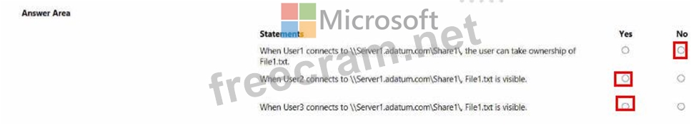 The share permissions for Share1 are configured as shown in the Share Permissions exhibit. (Click the Share Permissions tab.) Share1 contains a file named Filel.txt. The advanced security settings for Filel.txt are configured as shown in the File Permissions exhibit. (Click the File Permissions tab.) For each of the following statements, select Yes if the statement is true. Otherwise, select No.
