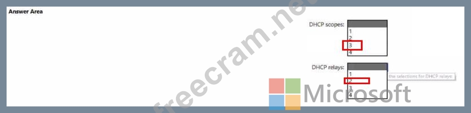 What is the minimum number of scopes and DHCP relays you should create? To answer, select the appropriate options in the answer area.
