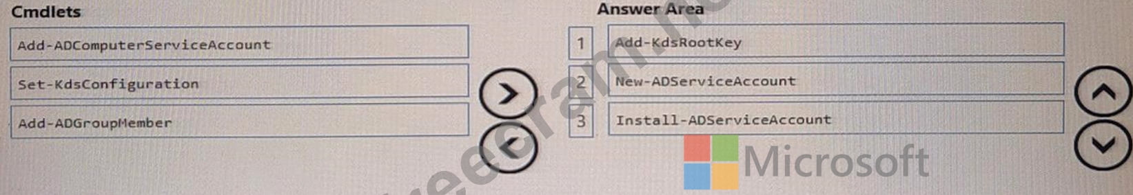 Which three PowerShell cmdlets should you run in sequence? To answer, move the appropriate cmdlets from the list of cmdlets to the answer area and arrange them in the correct order.