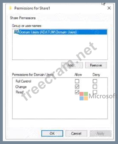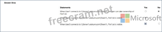 The domain contains a 'He server named Server1 and three users named User1. User2 and User), Server1 contains a shared folder named Share1 tha1 has the following configurations: