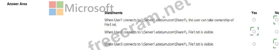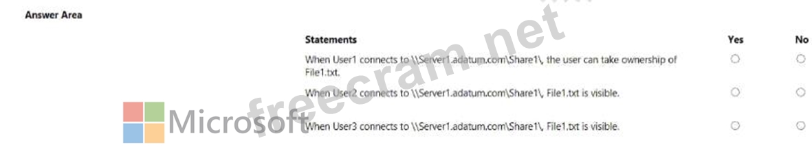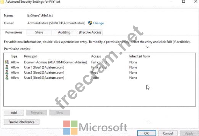 The share permissions for Share1 are configured as shown in the Share Permissions exhibit. (Click the Share Permissions tab.) Share1 contains a file named Filel.txt. The advanced security settings for Filel.txt are configured as shown in the File Permissions exhibit. (Click the File Permissions tab.) For each of the following statements, select Yes if the statement is true. Otherwise, select No.