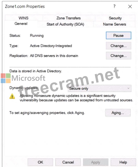 On Server1, you create a DNS zone named Zone1.com as shown in the following exhibit.