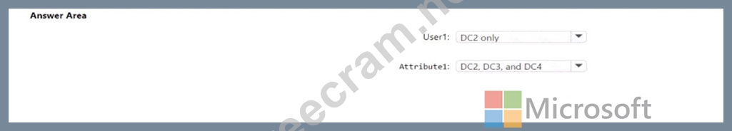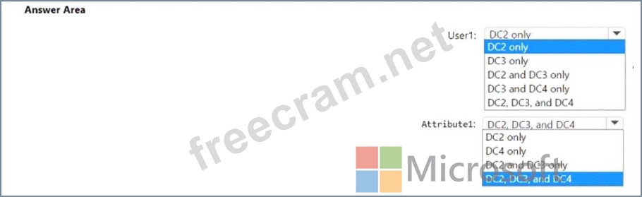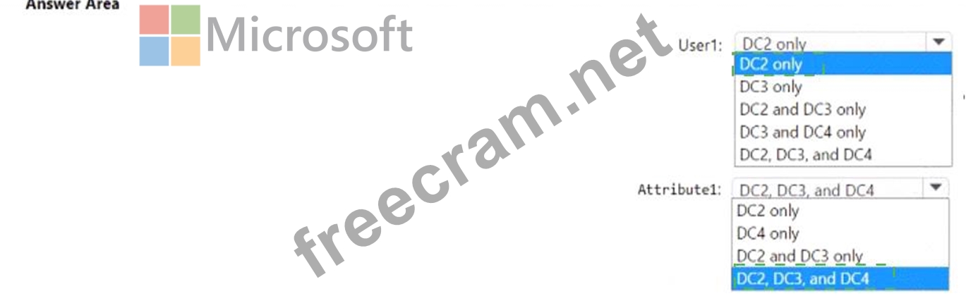 To which domain controllers are User1 and Attribute1 replicated? To answer, select the appropriate options in the answer area.