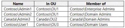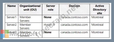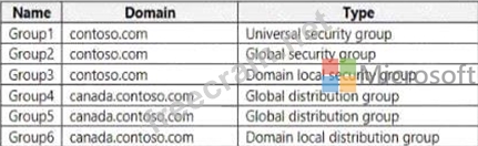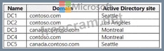 The forest contains two domains named contoso.com and canada.contoso.com. The forest contains the domain controllers shown in the following table.