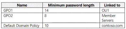 The contoso.com domain has the Group Policies Objects (GPOs) shown in the following table.