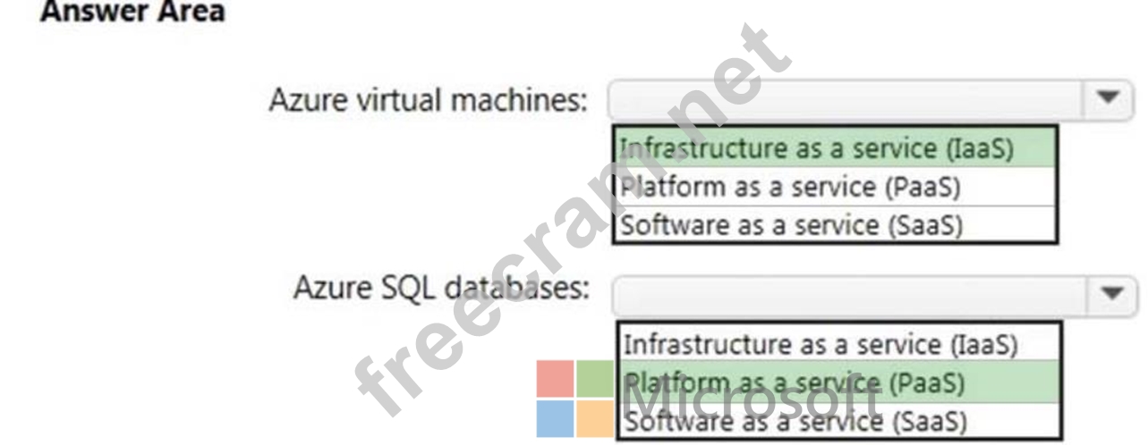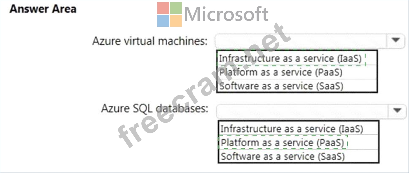 Which cloud deployment solution is used for Azure virtual machines and Azure SQL databases? To answer, select the appropriate options in the answer area.