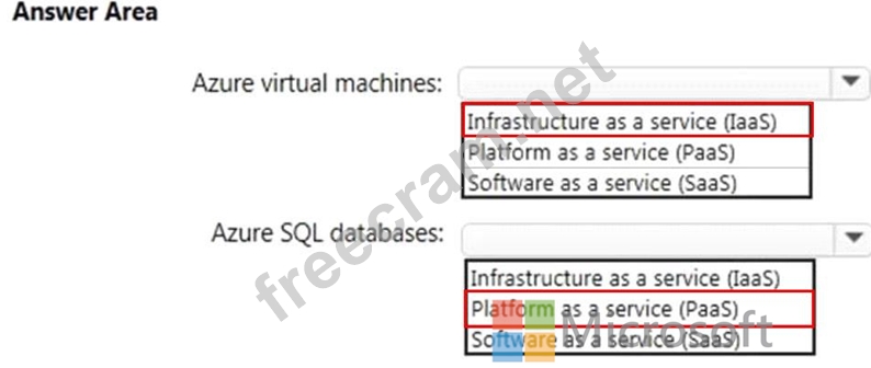 Which cloud deployment solution is used for Azure virtual machines and Azure SQL databases? To answer, select the appropriate options in the answer area.