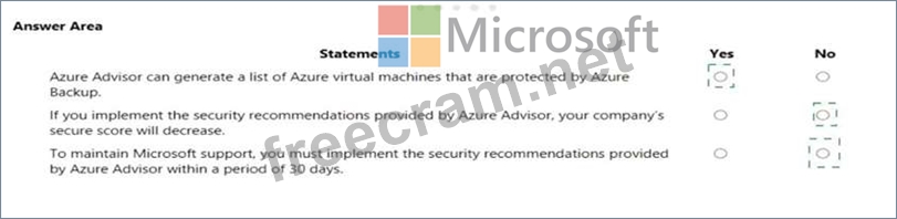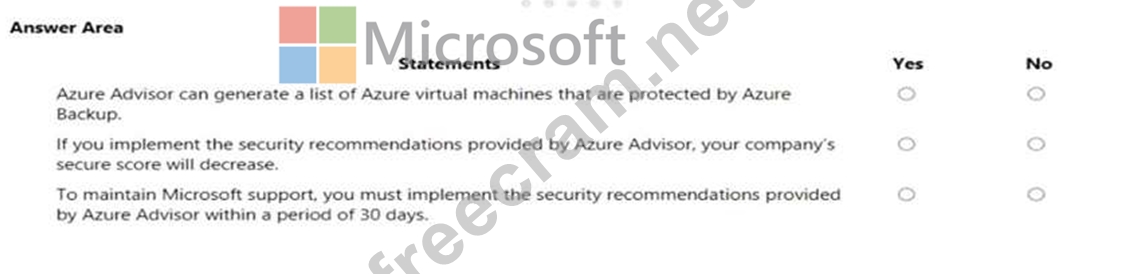 All three answers should be "No". Azure Advisor does not generate a list of virtual machines that ARE protected by Azure Backup. Azure Advisor does however, generate a list of virtual that ARE NOT protected by Azure Backup.