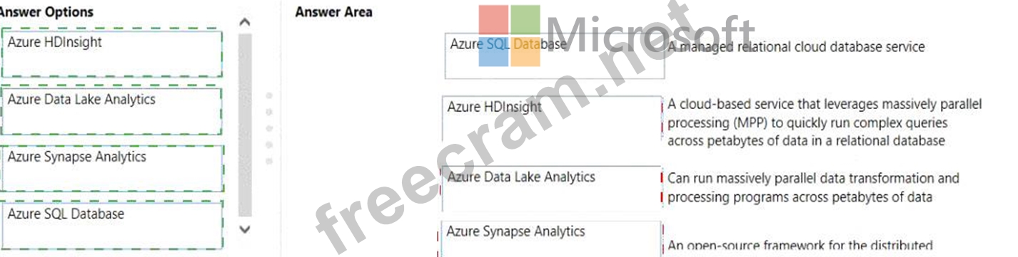 Instructions: To answer, drag the appropriate Azure service from the column on the left to its description on the right. Each service may be used once, more than once, or not at all NOTE: Each correct match is worth one point.