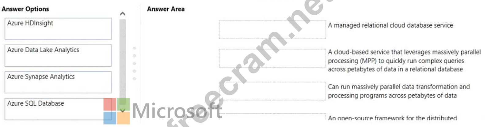 Instructions: To answer, drag the appropriate Azure service from the column on the left to its description on the right. Each service may be used once, more than once, or not at all NOTE: Each correct match is worth one point.