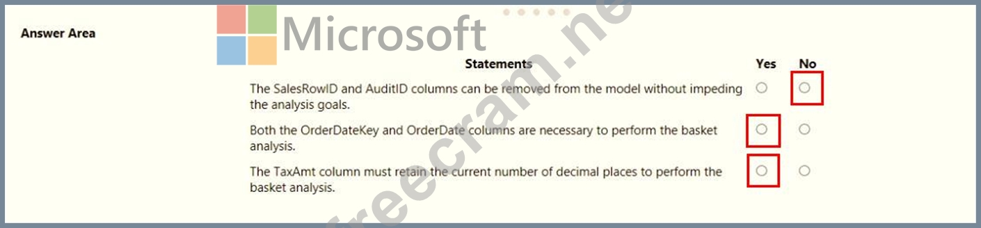According to the definition of basket analysis, the answer should be. Yes - SalesRowId = SalesOrderNumber + SalesOrderLineNumber. So, it can be removed. AuditId does not contain order or purchase related information. So, it can be removed. Yes - OrderDateKey and OrderDate contains order related information which is needed for basket analysis. No - TaxAmt does not affect the basket analysis so it is not a must to retain.