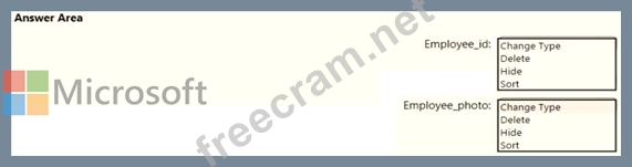 You are creating an analytics report that will consume data from the tables shown in the following table. There is a relationship between the tables. There are no reporting requirements on employeejd and employee_photo. You need to optimize the data model What should you configure for employeejd and employee.photo? To answer, select the appropriate options in the answer area.