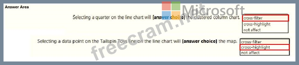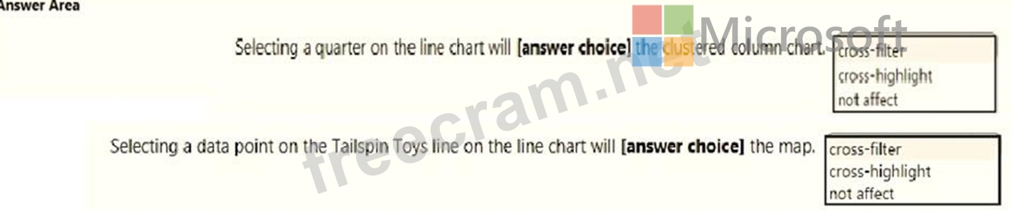 You have a report page that contains the visuals shown in the following exhibit. Use the drop-down menus to select the answer choice that completes each statement based on the information presented in the graphic. NOTE: Each correct selection is worth one point.