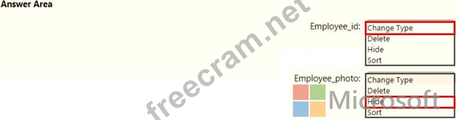 You are creating an analytics report that will consume data from the tables shown in the following table. There is a relationship between the tables. There are no reporting requirements on employeejd and employee_photo. You need to optimize the data model What should you configure for employeejd and employee.photo? To answer, select the appropriate options in the answer area.