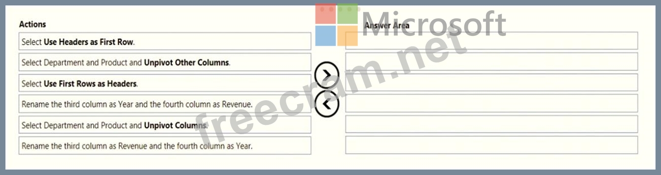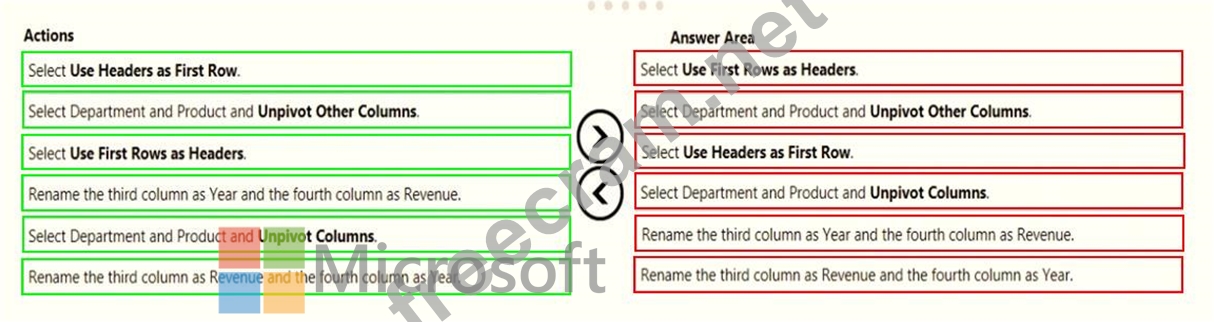 Only 3 actions are needed. 1. Select First Rows as Headers 2. Select Department and Product and Unpivot Other Columns 3. Rename the third column as Year and the fourth column as Revenue The solution has been verified in Power BI desktop with the table provided in the question. After the first steps, "Department Product 2016 2017 2018 2019" will become the column name. In the second steps, column name 2016 2017 2018 2019 will become the third column and the numbers will become the forth column. In the third steps, name the third and forth column correctly.