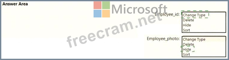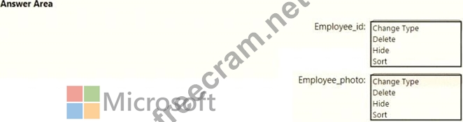 You are creating an analytics report that will consume data from the tables shown in the following table. There is a relationship between the tables. There are no reporting requirements on employeejd and employee_photo. You need to optimize the data model What should you configure for employeejd and employee.photo? To answer, select the appropriate options in the answer area.