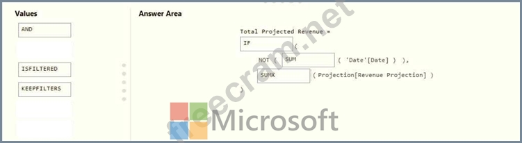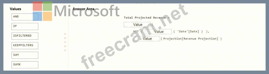You need to create a DAX measure in the data model that only allows users to see projections at the appropriate levels of granularity. How should you complete the measure? To answer, drag the appropriate values to the correct targets. Each value may be used once, more than once, or not at all. You may need to drag the split bar between panes or scroll to view content. NOTE: Each correct selection is worth one point.