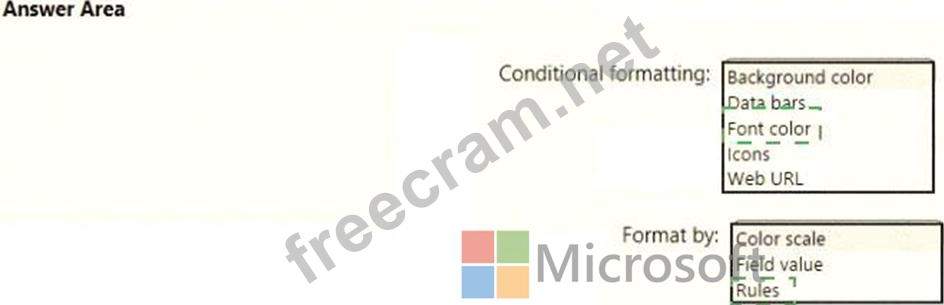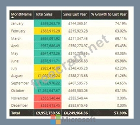 You need to create a visual as shown in the following exhibit. The indicator color for Total Sales will be based on % Growth to Last Year. The solution must use the existing calculations only. How should you configure the visual? To answer, select the appropriate options in the answer area. NOTE: Each correct selection is worth one point.