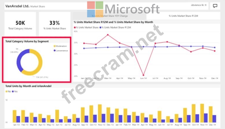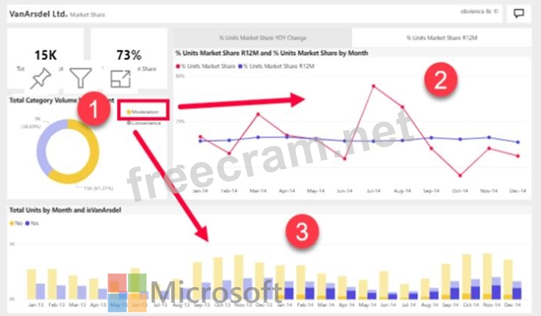 3. Cross-highlighting retains all the original data points but dims the portion that does not apply to your selection. Selecting Moderation in the doughnut chart cross-highlights the column chart. The column chart dims all the data that applies to the Convenience segment and highlights all the data that applies to the Moderation segment.