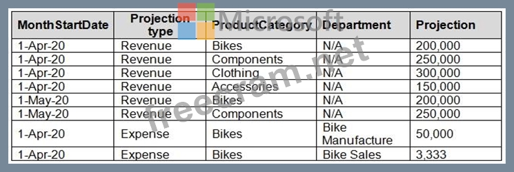 Net income projection data is stored in a SharePoint Online list named Projections in the format shown in the following table.