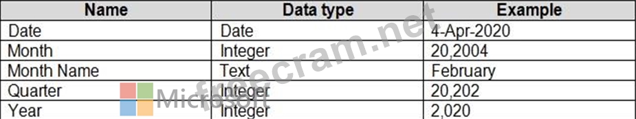 Projections must contain a column named RevenueProjection that contains the revenue projection amounts. A relationship must be created from Projections to a table named Date that contains the columns shown in the following table.