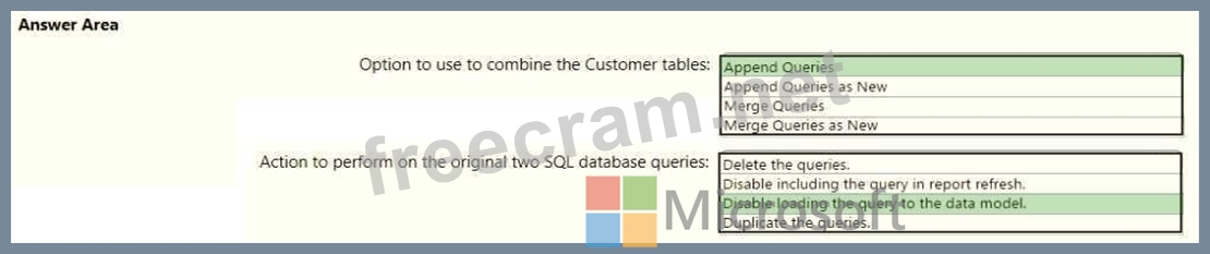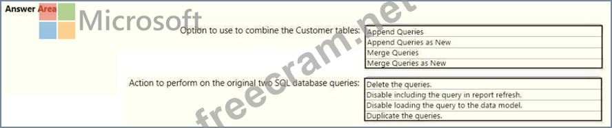 You need to combine the Customer tables into a single table. The solution must minimize the size of the data model and support scheduled refresh in powerbi.com.