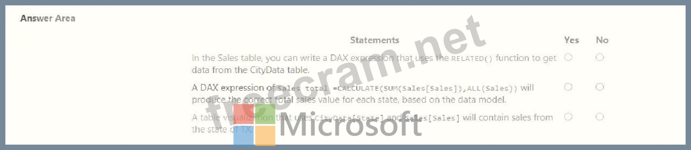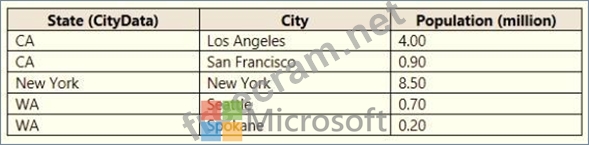 You are creating a Microsoft Power Bl model that has two tables named CityData and Sales. CityData contains only the data shown in the following table.